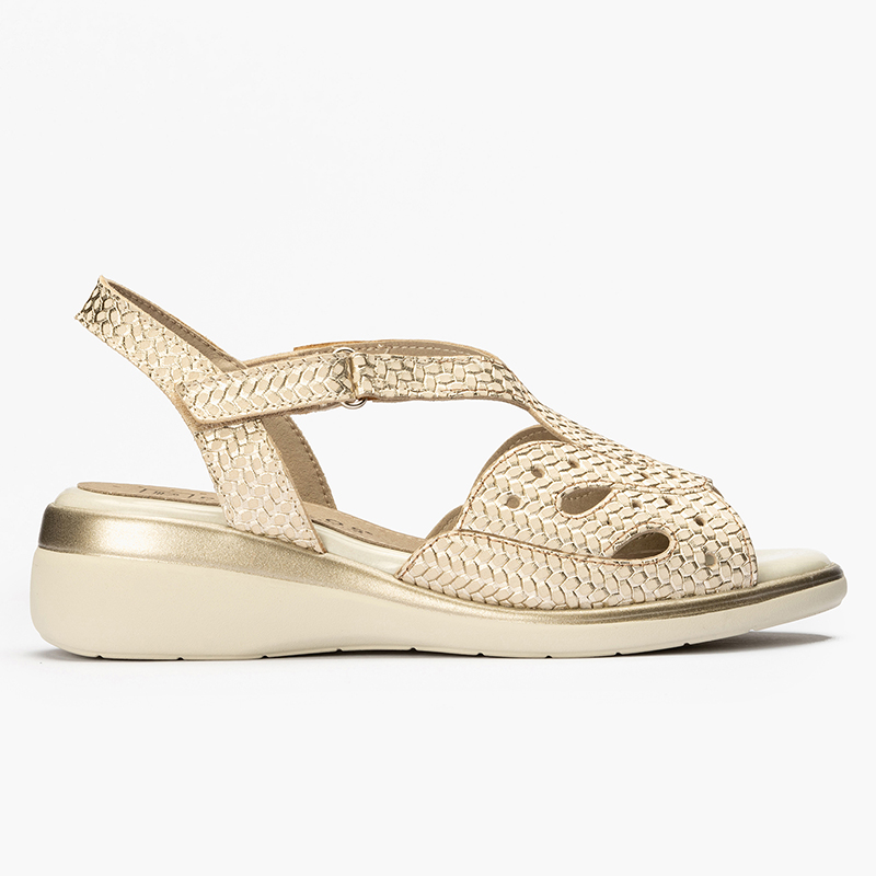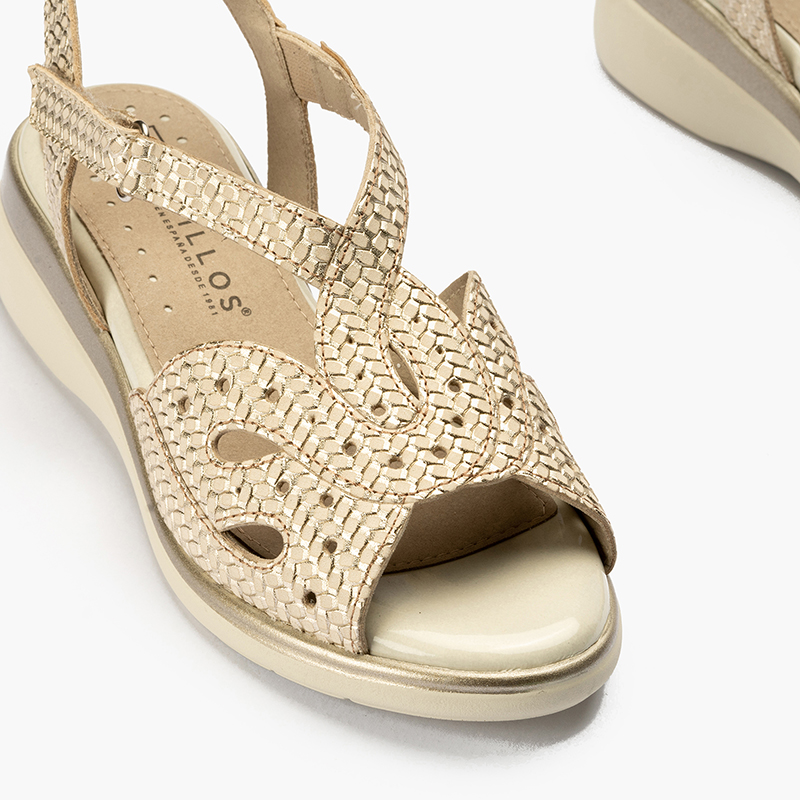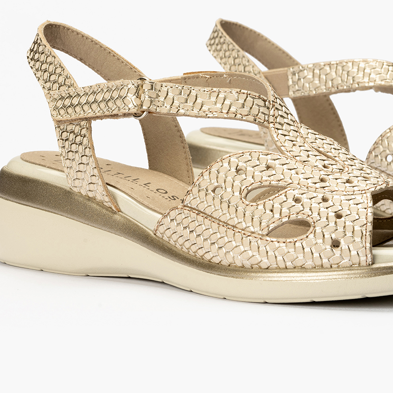 Sandalia con cuña del fabricante Pitillos. Este modelo es muy ligero, fabricado en piel grabado con espiga. Cierre de velcro en el empeine. Plantilla acolchada.