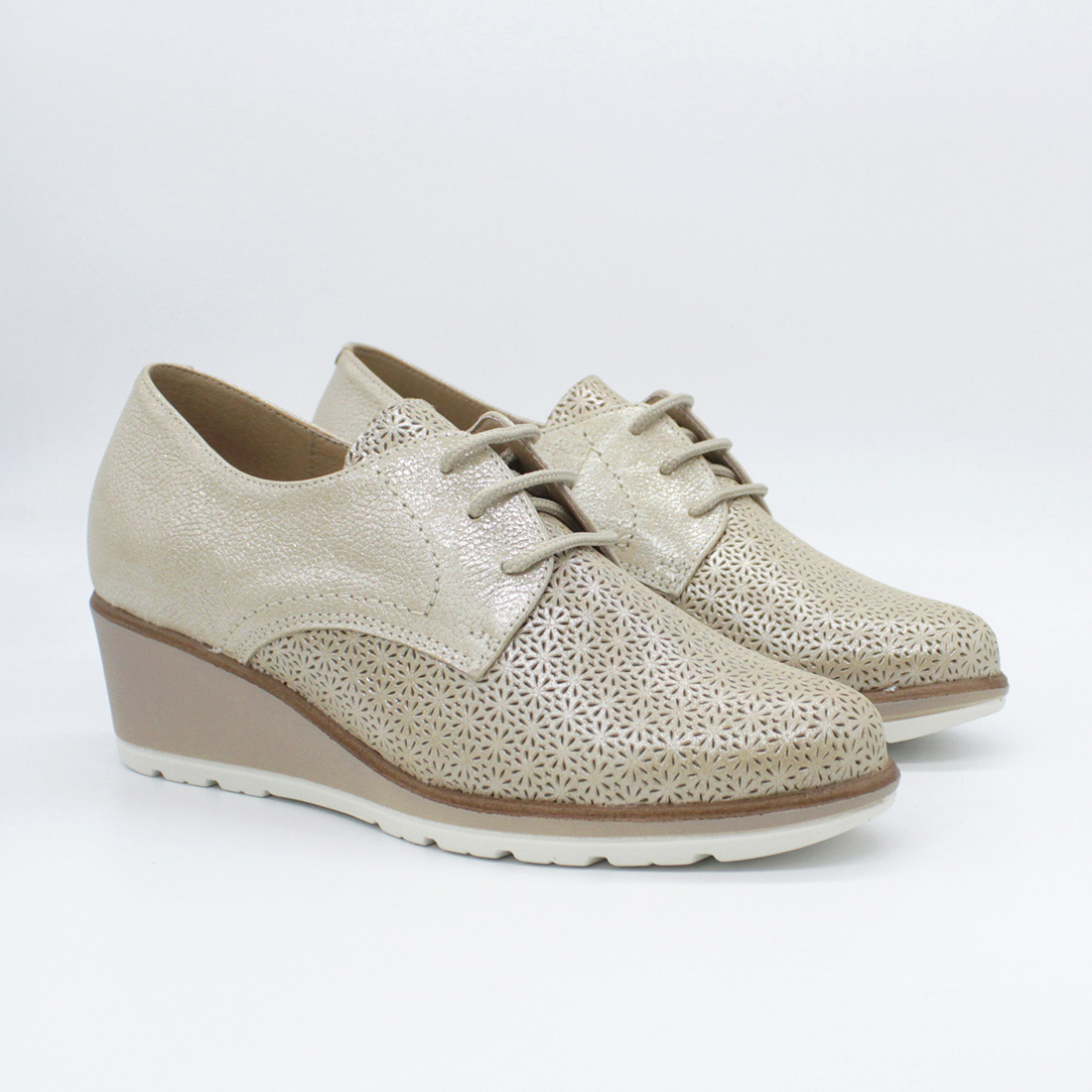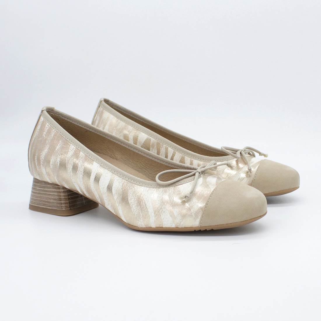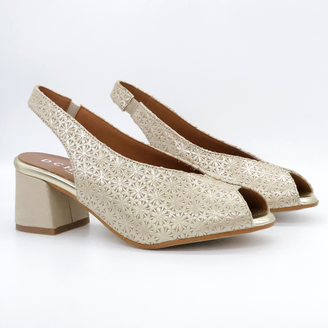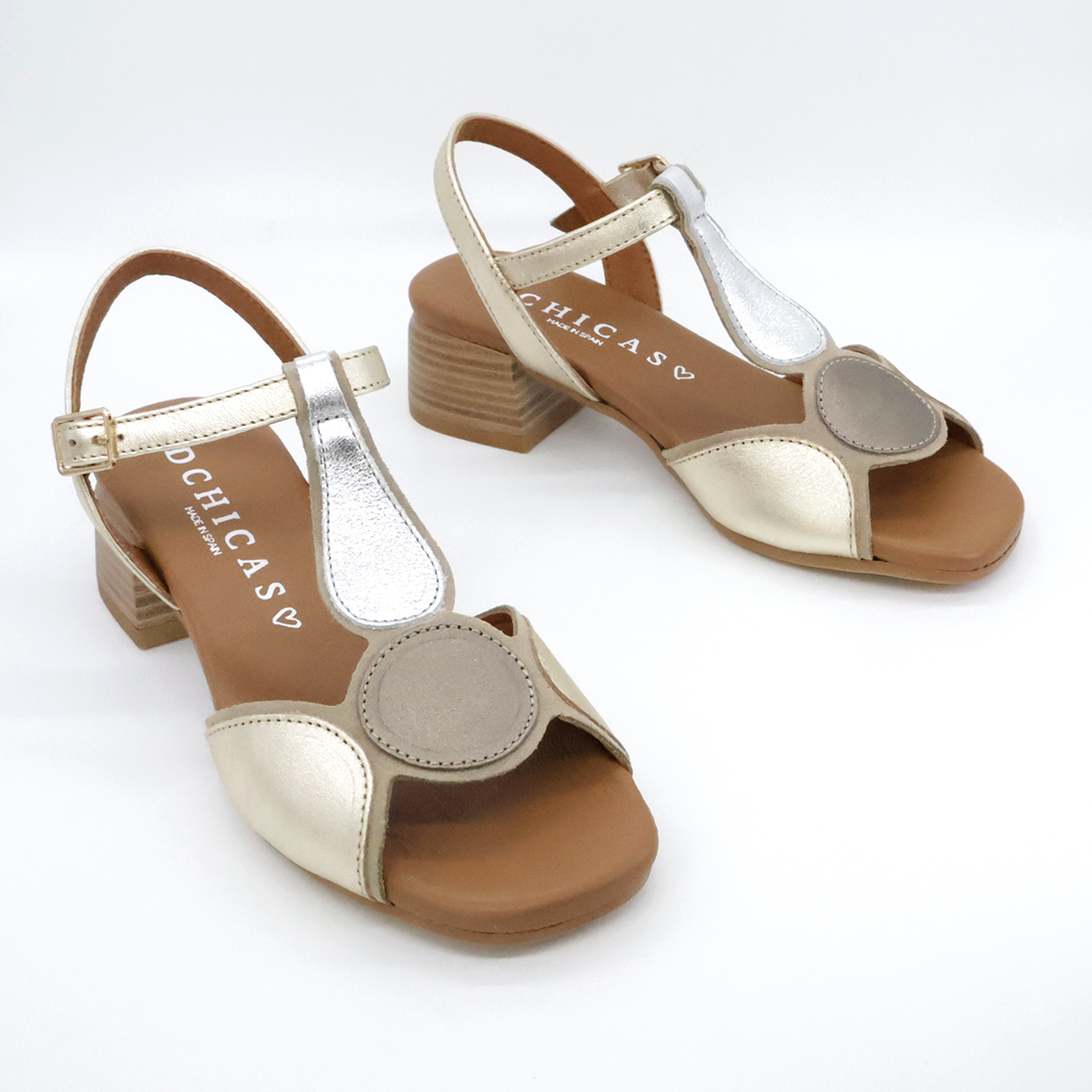 Sandalias de tacón para mujer de la marca DChicas, fabricadas en piel de alta calidad con una elegante combinación de dorado y plateado en todo su diseño. El modelo presenta un tacón ancho de altura media, forrado en material con textura de madera. Cierre de hebilla ajustable en el tobillo para un ajuste perfecto. Plantilla acolchada para mayor confort y suela de goma antideslizante. Unas sandalias que aportan un toque de sofisticación y estilo a cualquier look de verano.